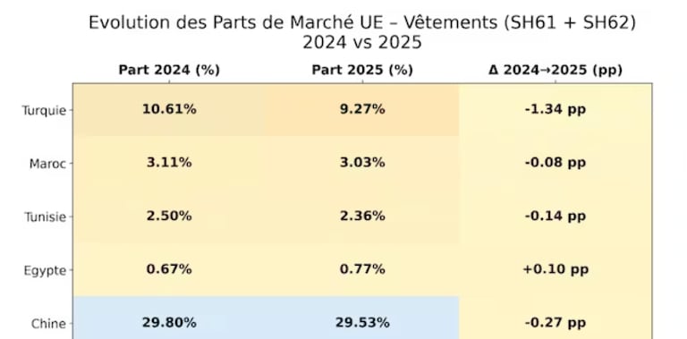 Los últimos datos de Eurostat sobre las importaciones europeas de prendas de vestir (SH61 + SH62) para 2024-2025 revelan una reconfiguración acelerada del mercado. Aunque las dinámicas asiáticas dominan los análisis, el impacto sobre los proveedores africanos geográficamente cercanos —Marruecos, Túnez y Egipto— es palpable y desigual. El examen de estas cifras demuestra con claridad qué país soporta la mayor presión competitiva.
