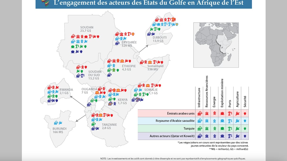 Al igual que Qatar y Emiratos, Arabia Saudí busca diversificar una economía basada en los hidrocarburos. Riad pretende asimismo invertir en mercados poco explotados —o explotados de forma muy limitada—, especialmente en energías renovables, infraestructuras y agricultura. El Reino ha invertido alrededor de 16.000 millones de dólares en África oriental, principalmente en estos tres sectores.