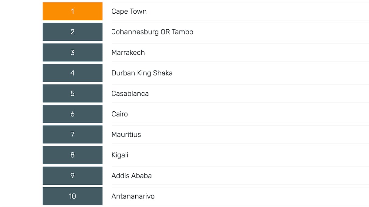 A nivel continental, el Top 10 de los mejores aeropuertos incluye tres sudafricanos, dos marroquíes, uno egipcio, uno mauriciano, uno etíope, uno ruandés y uno malgache.