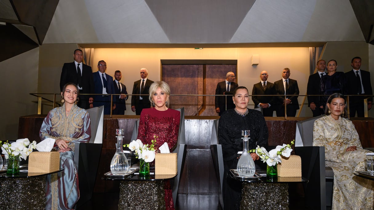 Antes de dirigirse al palco real para seguir el espectáculo, las princesas —entre ellas Lalla Hasnaa, presidenta de la Fundación del Teatro Real de Rabat—, junto con Brigitte Macron, fueron saludadas por los miembros del Consejo de Administración de la Fundación.