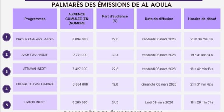 Por su parte, «Ach Tmaa», que lideraba la clasificación de Al Aoula la semana pasada con 8,2 millones de espectadores, cae al segundo puesto con 7,7 millones y una cuota del 30,4%. Emitida cada día a las 19h30, está dirigida por Ayoub Lahnoud y cuenta con Saadia Ladib, Meryem Zaimi, Amine Ennaji, Mounia Lemkimel y Saâd Mouaffak en el reparto.