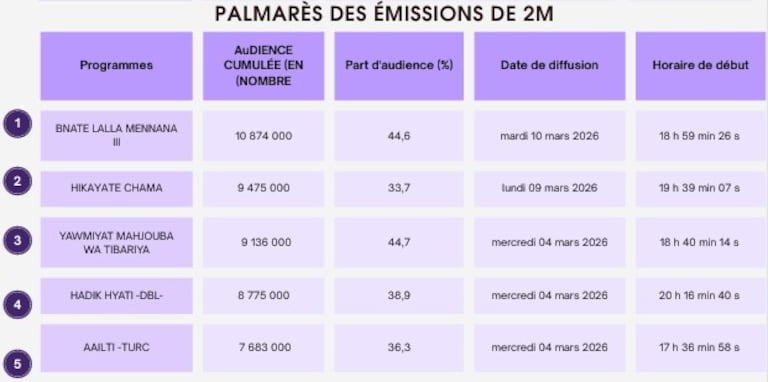 A la cabeza del ranking, considerando todas las cadenas, la tercera temporada de «Bnat Lalla Mennana», dirigida por Chaouki El Oufir y protagonizada por Samia Akariou, Nora Skalli y Saadia Ladib, sigue siendo la serie más vista del Ramadán. Sin embargo, con 10,8 millones de espectadores, registra un descenso significativo respecto a la primera semana, cuando alcanzó un máximo de 12,3 millones, según los datos del Centro Interprofesional de Medición de Audiencias (CIAUMED).