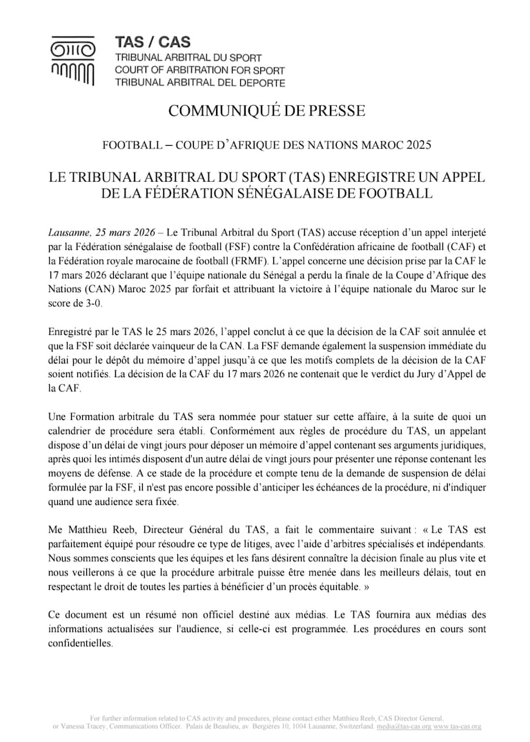 El Tribunal Arbitral del Deporte (TAS) registró este miércoles 25 de marzo el recurso de la Federación Senegalesa de Fútbol (FSF) contra la Confederación Africana de Fútbol (CAF) y la Federación Real Marroquí de Fútbol (FRMF), en relación con la decisión adoptada por el Comité de Apelación de la CAF el pasado 17 de marzo, que validó la derrota por incomparecencia de Senegal en la final de la CAN 2025.