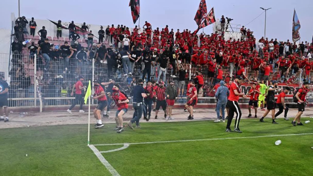 Minutos antes del horario previsto para el comienzo del choque, los ultras desplazados desde Argelia rompieron los protocolos de seguridad y ocuparon diversas zonas del césped mientras multiplicaban las provocaciones mediante el encendido de bombas de humo y el lanzamiento de proyectiles.