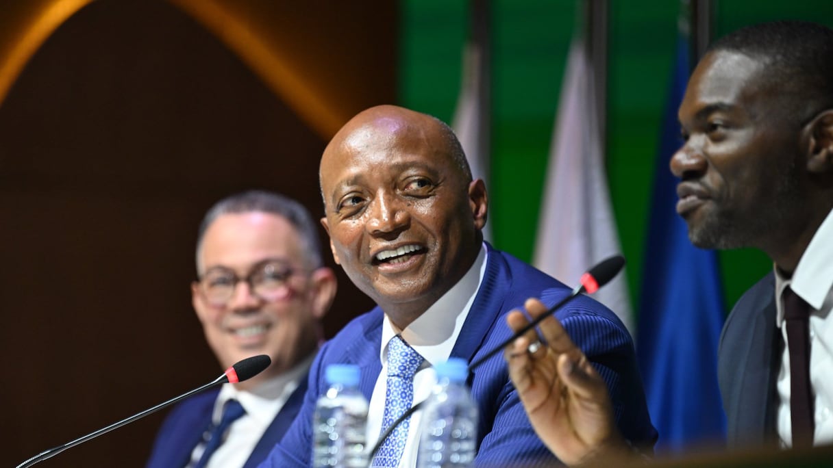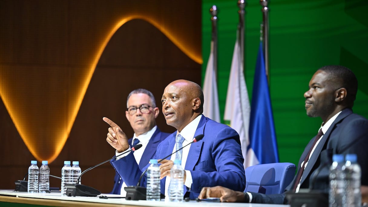 Patrice Motsepe, presidente de la CAF, ofreció una rueda de prensa en Maâmora, junto a su secretario general interino, Samson Adamu, en presencia de Fouzi Lekjaa, presidente de la FRMF. Fuente: FRMF