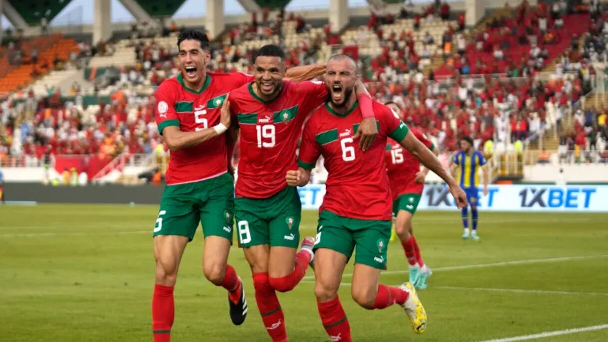 Romain Saïss celebra con sus compañeros el primer gol de Marruecos ante Tanzania en 2023.