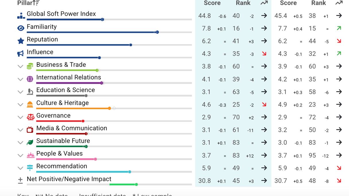 Marruecos completa el podio africano con una puntuación de 40,6, idéntica a la de la edición anterior. Sus resultados se sustentan en los indicadores de notoriedad (5,7/10, 53º mundial), reputación (6,0; 51º) y recomendaciones (5,7; 60º). Sin embargo, el Reino muestra márgenes de mejora en áreas como medios y comunicación (2,9; 76º), educación y ciencia (2,8; 76º) y gobernanza (3,0; 59º).