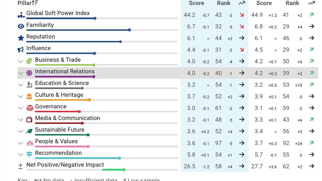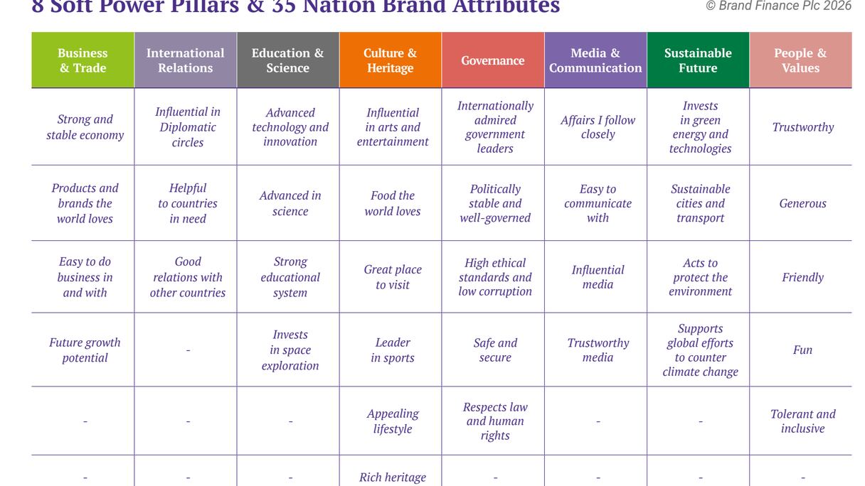 En segundo lugar, se analiza una batería de ocho pilares del soft power —negocios y comercio, relaciones internacionales, ciencia y educación, cultura y tradiciones, medios y comunicación, población y valores, gobernanza y futuro sostenible— junto a 35 atributos de la marca país. Por último, se evalúa la capacidad de una nación para atraer inversiones, comercio, talento y turismo.