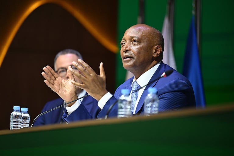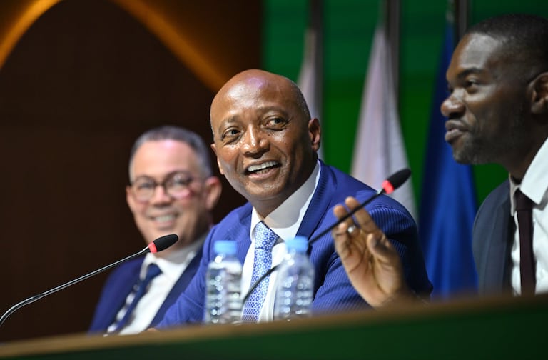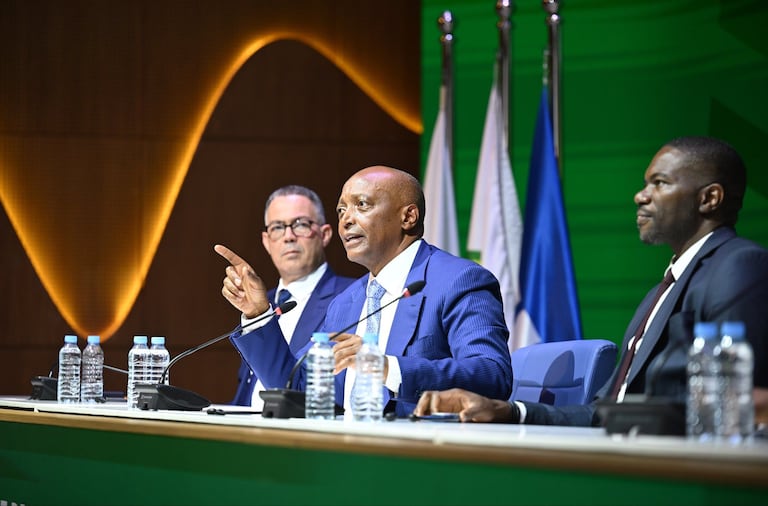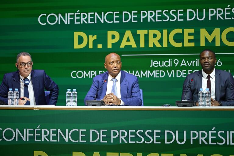 Patrice Motsepe, presidente de la CAF, ofreció una rueda de prensa en Maâmora, junto a su secretario general interino, Samson Adamu, en presencia de Fouzi Lekjaa, presidente de la FRMF. Fuente: FRMF