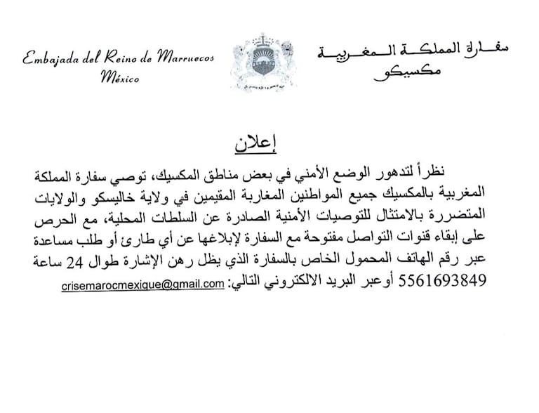 La Embajada, que continúa siguiendo de cerca la evolución de la situación de seguridad en el país, comunicará cualquier nueva información o dato adicional que sea necesario, con el fin de garantizar la seguridad de todos los ciudadanos marroquíes presentes en México.
