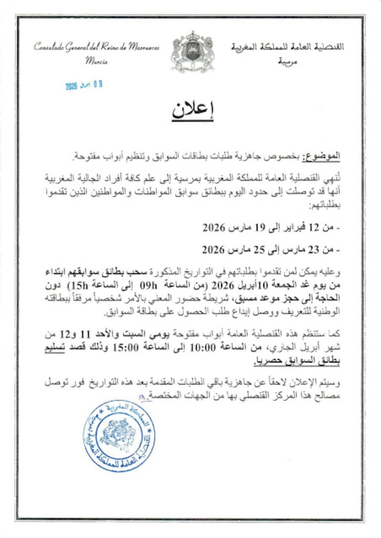 El Consulado General del Reino de Marruecos en Murcia abrirá de manera excepcional durante el fin de semana del 11 y 12 de abril para la entrega de certificados de antecedentes penales a miembros de la comunidad marroquí.